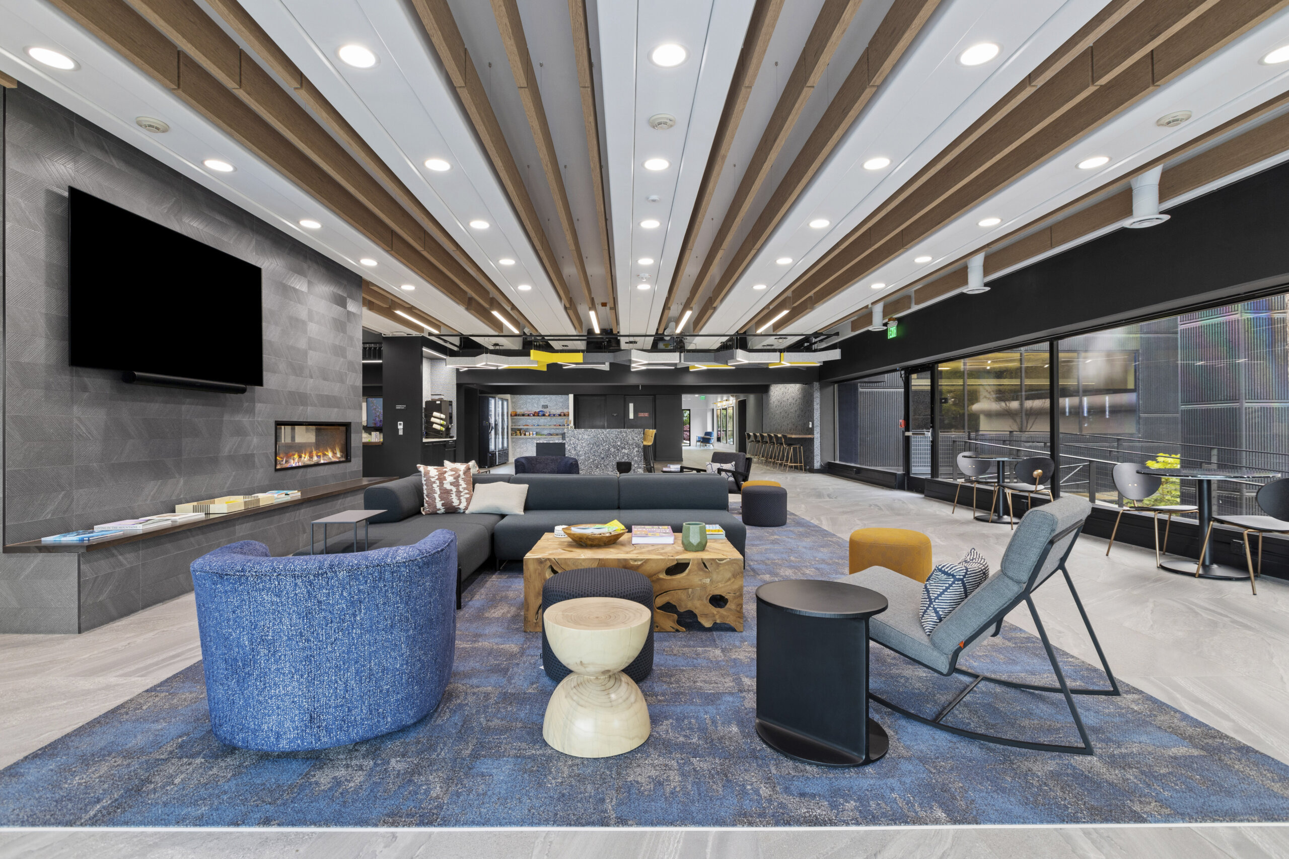 When KORE Bellevue Technology Center decided to completely renovate its common area and create The HUB @ BTC (Bellevue Technology Center), they called on Nelson Architects and DP Incorporated to create a fresh modern space that is both inviting and relaxing. The idea was to create an environment where one can find a quite space in one of the three reading rooms, hold a team meeting in one of the two large conference rooms, grab a beer and a snack from the island bar and have a casual meeting on either side of the floor to ceiling see through gas fireplace. Or better yet, open the accordion Nano doors and sit by the outdoor fire place and enjoy the sunshine with your team.